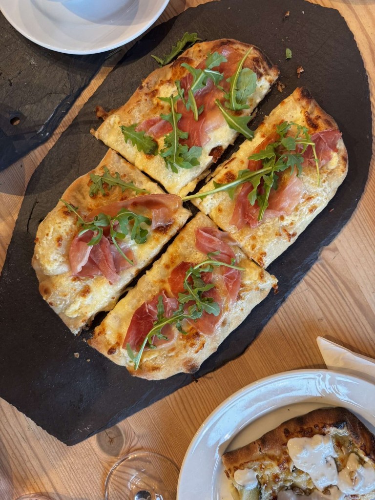 Serranoskinke, mozzarella, ruccula og pinjekjerner – hvit pizza.